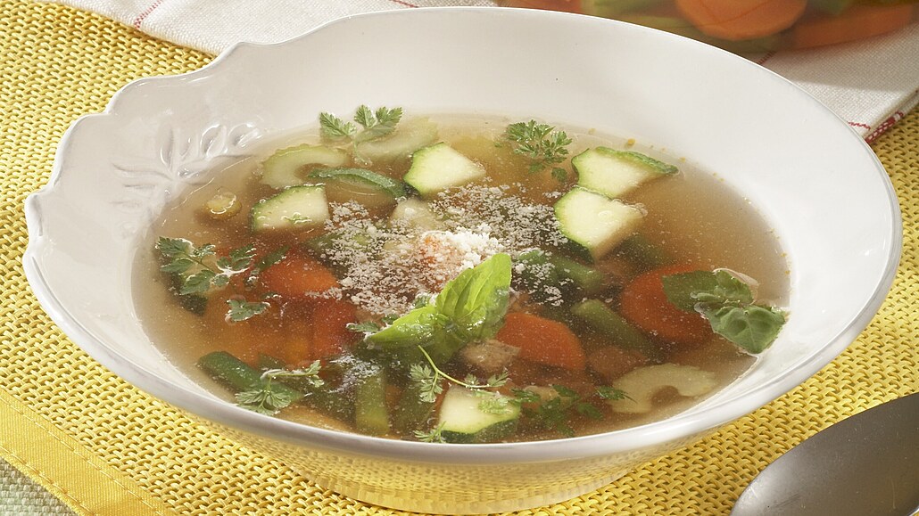 - Orestovanou zeleninu vložímeme do vroucího vývaru, přidáme celý pepř a polovinu nakrájených bylinek a na mírném ohni vaříme asi 10 minut. Podle potřeby dochutíme solí. Nakonec v polévce prohřejeme nakrájené maso. Při podávání posypeme zbylými bylinkami a nastrouhaným sýrem.