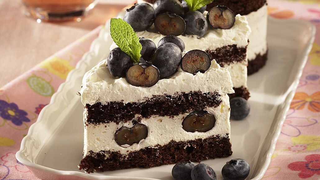 - Z korpusu vykrájíme formičkou 32 koleček. Polovinou z nich formičky vyložíme, na ně rozetřeme asi 2/3 tvarohové náplně, kterou proložíme polovinou očištěných borůvek. Přiklopíme zbylými kolečky a dortíky dáme vychladit. Pak je uvolníme z formiček, potřeme zbylým krémem a ozdobíme borůvkami, popřípadě i lístkem meduňky.