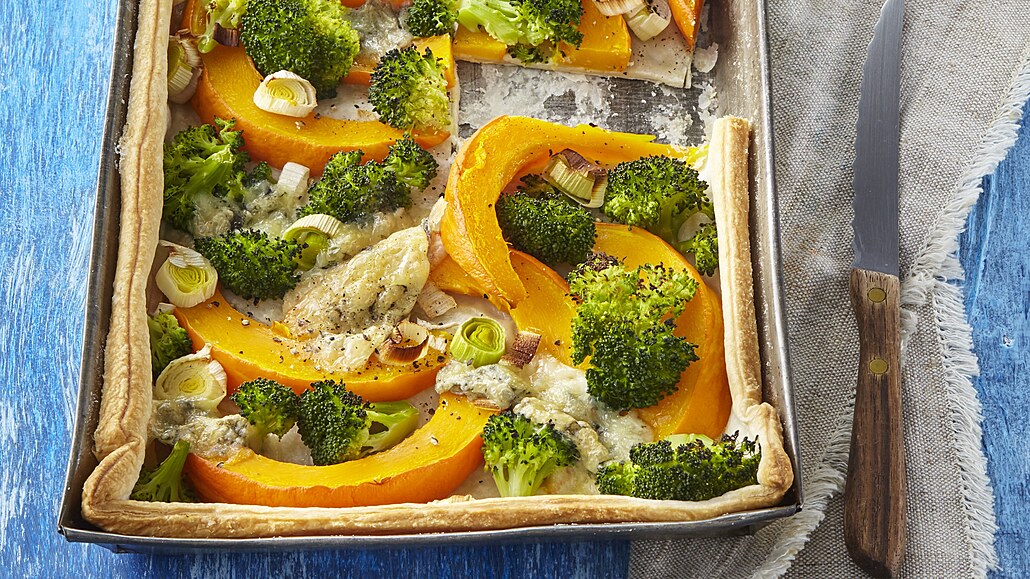 - Semínek zbavenou dýni nakrájíme na měsíčky. Brokolici rozdělíme na růžičky, krátce je povaříme v osolené vodě a necháme okapat. Pórek nakrájíme na kolečka.
