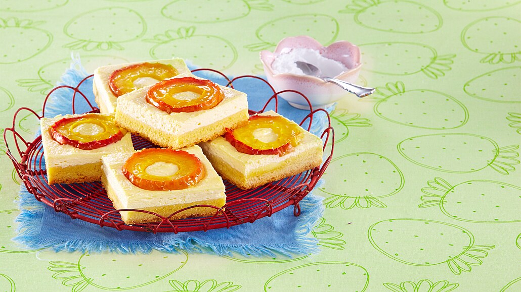 - Jablka očistíme, vykrajovátkem odstraníme jádřince a nakrájíme na kolečka silná asi 2 cm. Pokapeme je šťávou z půlky citronu a rozložíme na tvarohovou náplň. Pečeme v troubě vyhřáté na 180 °C asi 45 minut. Nakonec můžeme ozdobit lístky meduňky.