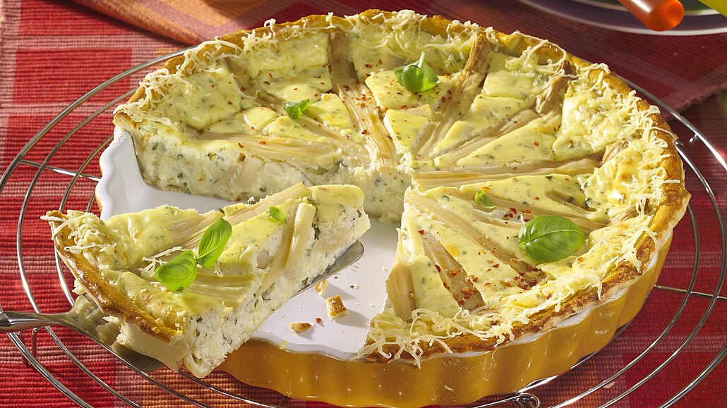 - Do formy nalijeme sýrovou směs, rozložíme na ni chřest a posypeme zbylým parmezánem. Troubu rozhřejeme na 220 °C a koláč pečeme asi 30 minut, až zezlátne a náplň ztuhne. Podáváme jej jak teplý, tak vychladlý, ozdobený lístky bazalky.
