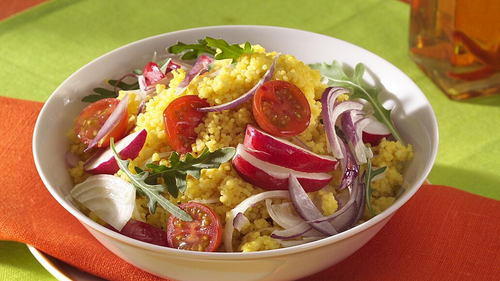 - Nabobtnalý kuskus promícháme s připravenou zeleninou a rozdělíme do misek. Salát zalijeme olivovým olejem, ozdobíme lístky rukoly a podáváme.