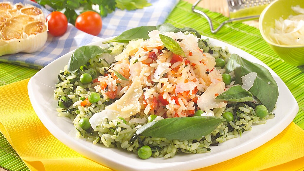 - Špenát a hrášek necháme rozvařit ve zbytku vývaru. Kaši propasírujeme a s polovinou másla, sýra, lístků bazalky a oregana vmícháme do poloviny dušené rýže. Uchováme v teple.