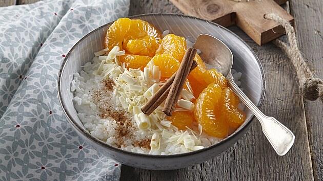 - Mandarinky slijeme a dozdobíme jimi hotovou rýžovou kaši. Podáváme posypané hoblinkami bílé čokolády.