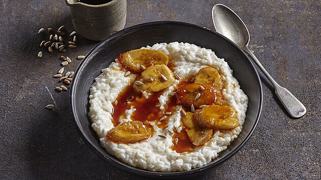 - Kaši osladíme medem, rozdělíme do talířů, poklademe banány a zalijeme zbylým karamelem. Posypeme praženými slunečnicovými semínky.