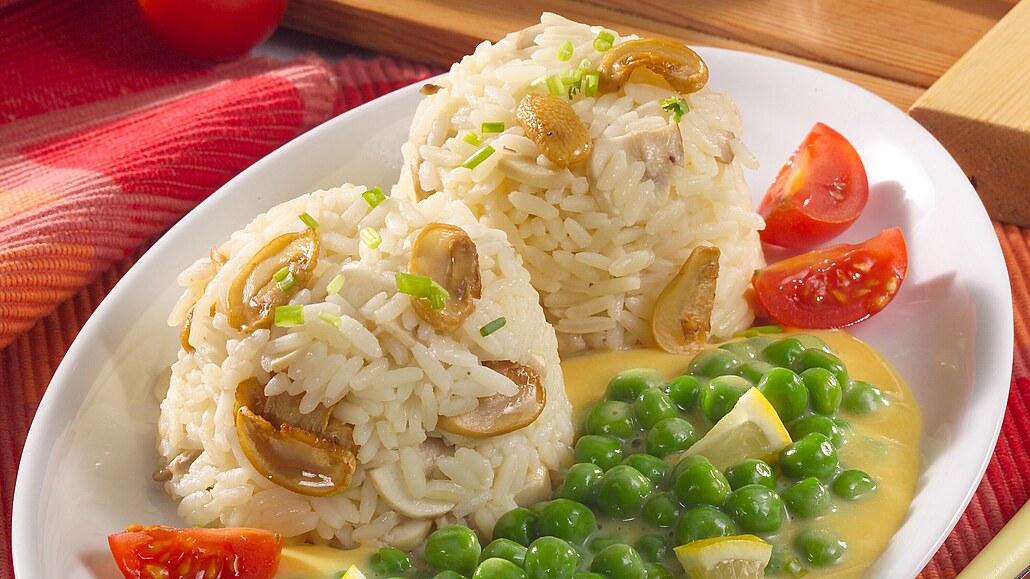 - Žampiony očistíme a nakrájíme na plátky. Na pánvi rozpálíme máslo a osmažíme na něm plátky žampionů. K orestovaným žampionům přidáme vařenou rýži, promícháme a podle chuti osolíme. Naběračkou nebo větším šálkem vytvoříme na talíře kopečky rýže a servírujeme společně s hráškovou omáčkou.