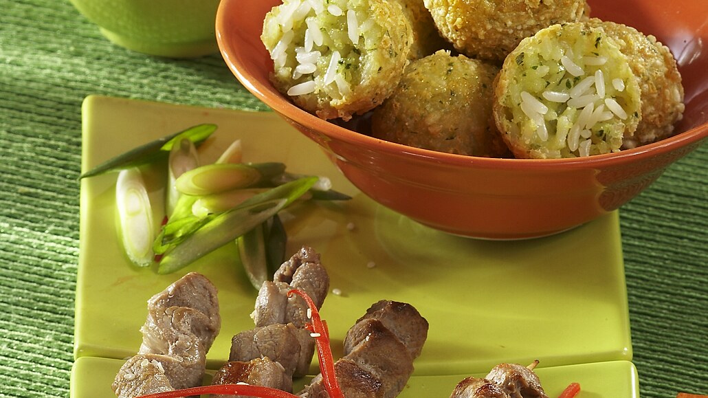 - Z rýžové hmoty vymodelujeme kuličky a uložíme je do chladničky zatuhnout. Poté je na rozpáleném oleji opečeme ze všech stran dozlatova.