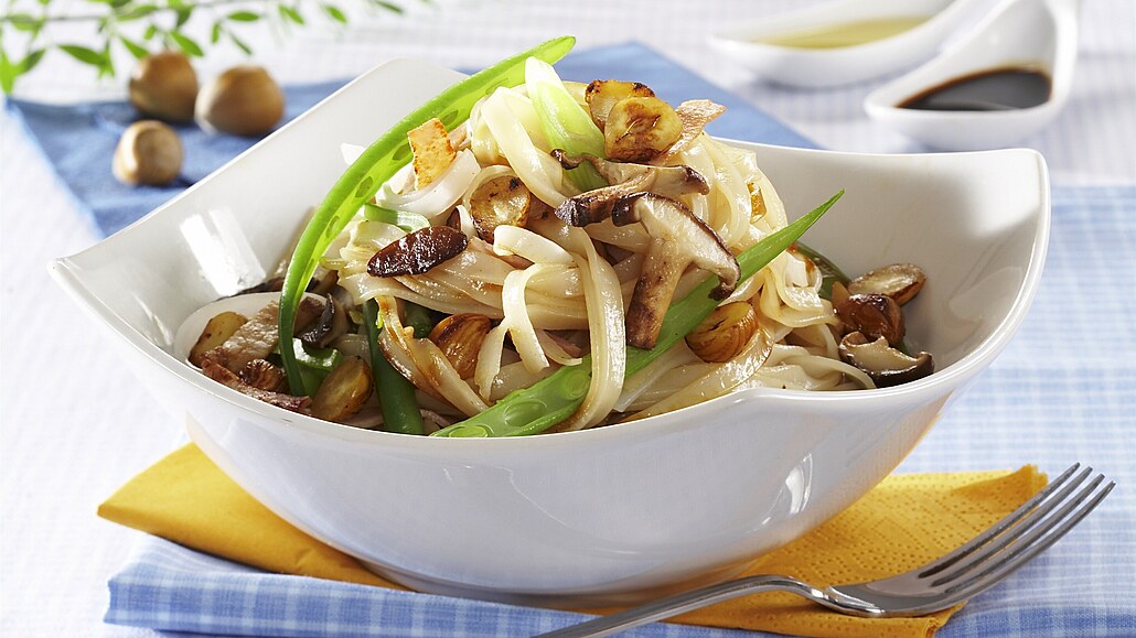 - V hluboké pánvi zahřejeme olej, přisypeme oříšky s fazolkami a na mírném plameni je asi minutu restujeme. Pak do směsi vmícháme šunku, houby a cibulku. Nakonec přidáme nudle, vše zalijeme sójovou omáčkou a necháme prohřát.