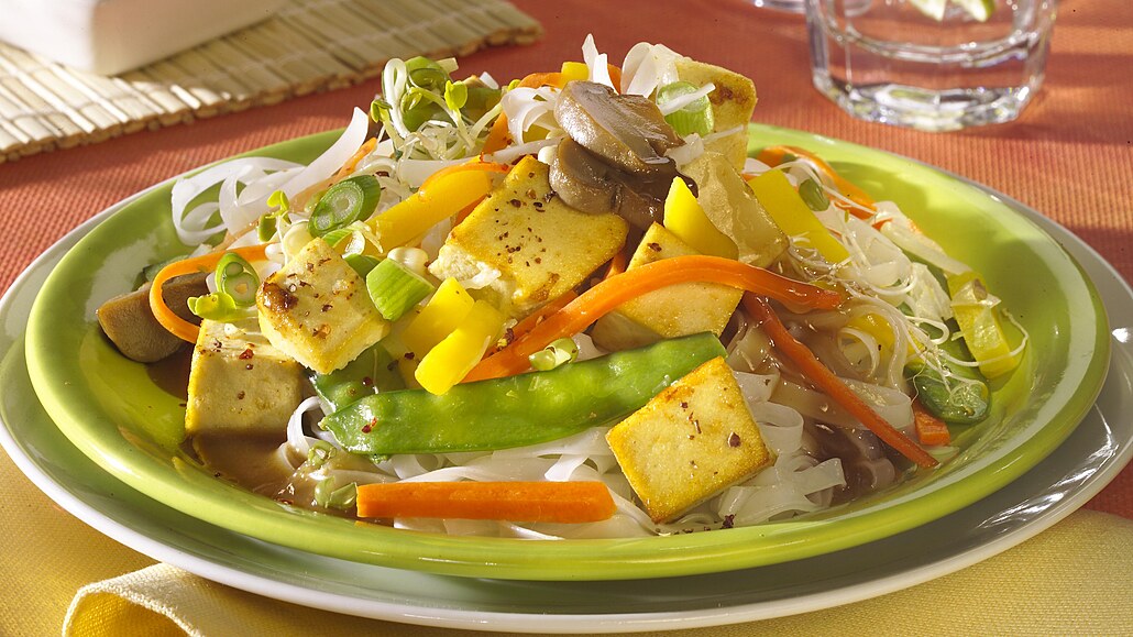 - Rýžové nudle připravíme podle návodu na obalu. Hotové nudle smícháme se směsí tofu a přelijeme připravenou omáčkou. Hotový pokrm posypeme výhonky.