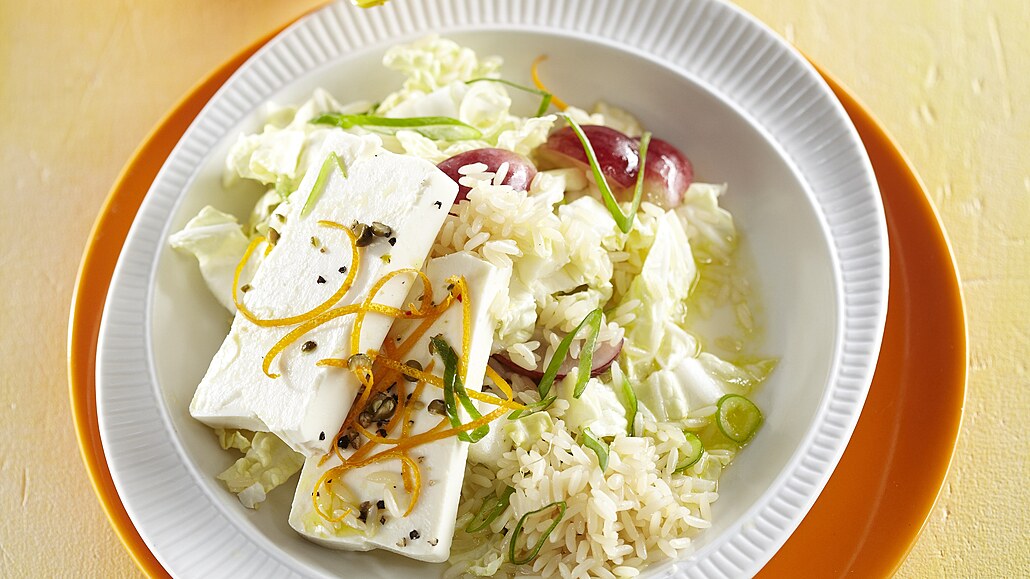 - Listy čínského zelí nakrájíme na 3 cm široké proužky (části od řapíků ještě vice najemno). Cibulku usekáme, kuličky vína rozkrojíme. Všechny suroviny smícháme s uvařenou rýží a pomerančovou šťávou. Na salát položíme proužky sýra a posypeme pomerančovou kůrou.