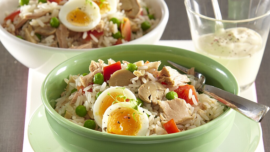 - Do rýže s hráškem vmícháme žampiony, papriku, tuňáka a pažitku. Směs promícháme a dochutíme solí a pepřem.