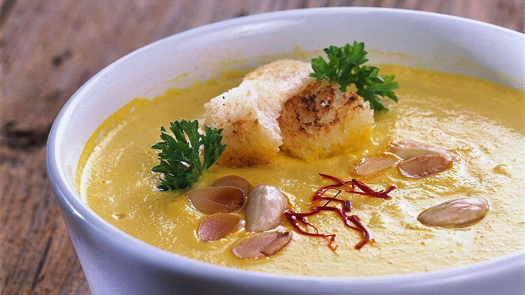 - Mezitím najemno nasekáme zbylou petrželku. Polovinu chlebových krutonů vmícháme do polévky a popřípadě ještě podle chuti okořeníme. Polévku rozdělíme do misek, posypeme zbylými chlebovými krutony, ozdobíme petrželkou, plátky mandlí a můžeme přidat i nitky šafránu.