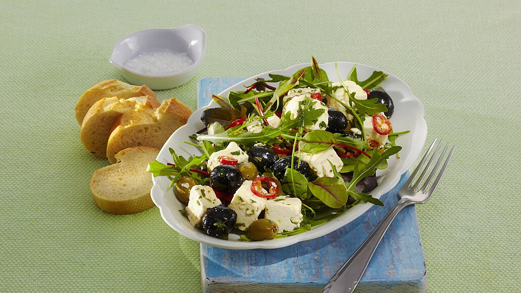- Salát opereme a necháme okapat. Poté ho rozdělíme na talíře a přidáme marinovaný sýr a olivy. Nakonec salát zakápneme citronovou šťávou a zbylou marinádou.