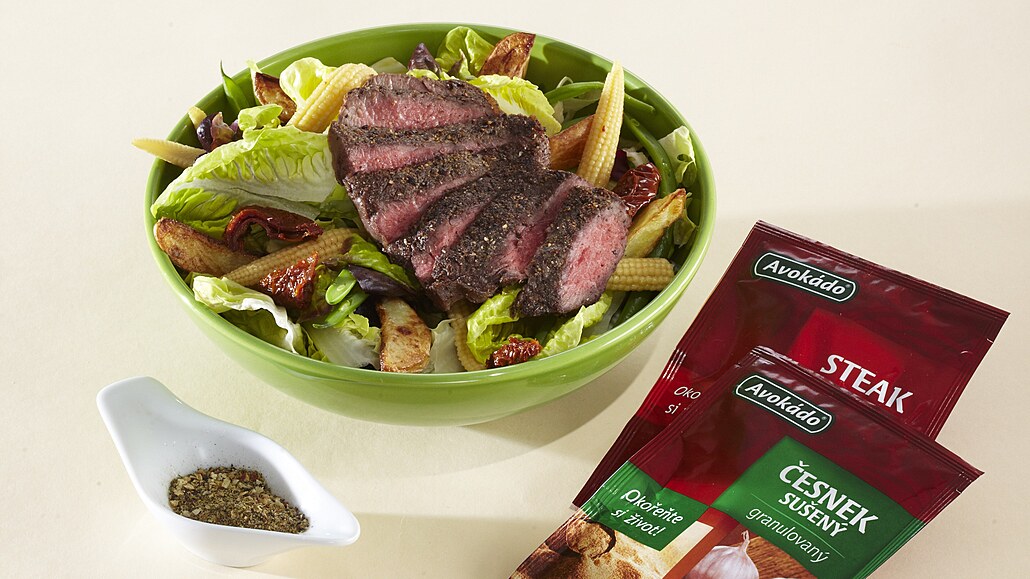 - Roštěnou nakrájíme na steaky a okořeníme kořenicí směsí steak. Na pánvi rozehřejeme olej a steaky opečeme zprudka z obou stran. Necháme je chvilku odpočinout a pak rozkrájíme. Salát rozdělíme do misek a na každý přidáme nakrájený steak.
