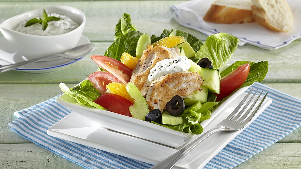 - Do misek rozdělíme připravenou zeleninu, pomeranč i olivy. Nahoru dáme maso a salát přelijeme dresinkem. Podáváme s čerstvým pečivem.
