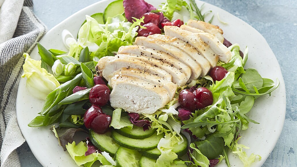 - Salát rozdělíme na servírovací talíře, zalijeme třešňovým dresinkem a poklademe na plátky nakrájenými kuřecími prsy. Ihned podáváme.