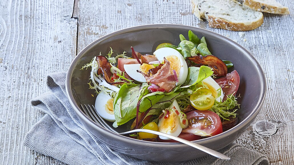 - Listové saláty dáme do mísy, přidáme pokrájená rajčata a opatrně promícháme s dresinkem. Salát rozdělíme do misek, přidáme opečenou slaninu a pokrájená vejce. Můžeme podávat s pečivem.