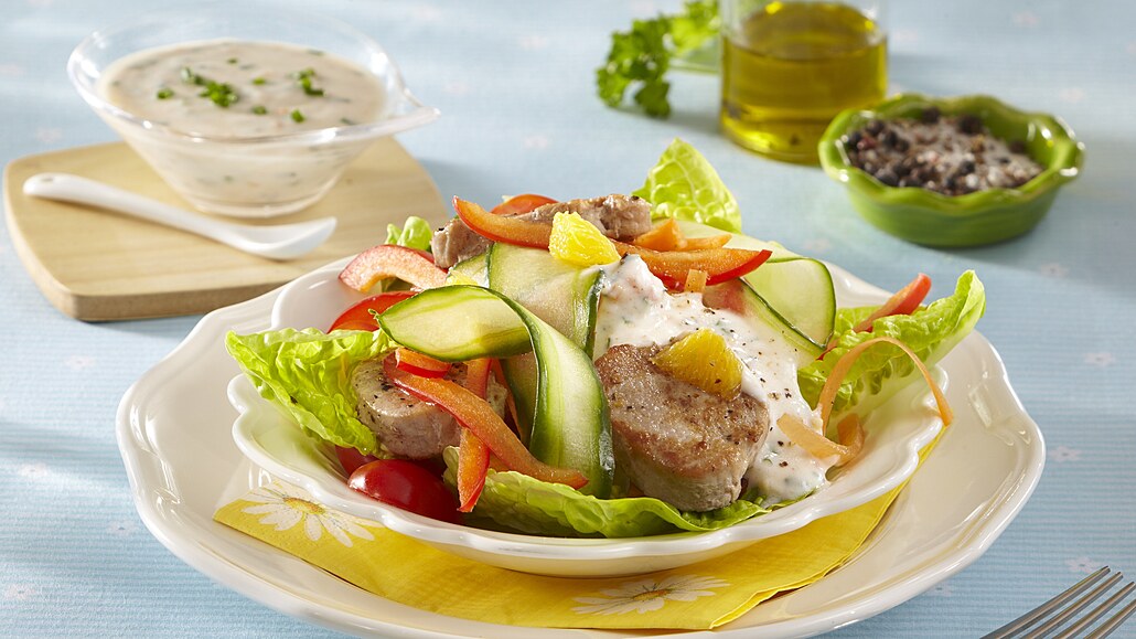 - Vepřovou panenku očistíme a nakrájíme na plátky. Osolíme je a okořeníme pepřem i oreganem. V pánvi rozpálíme olej a maso na něm zprudka z obou stran opečeme. Poté ho rozdělíme na připravený salát.