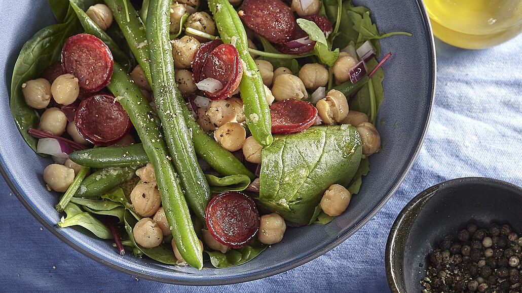 - Listový salát smícháme se zálivkou, směsí cizrny a klobásy a nakonec i s fazolkami. Při podávání posypeme najemno nakrájenou červenou cibulí.