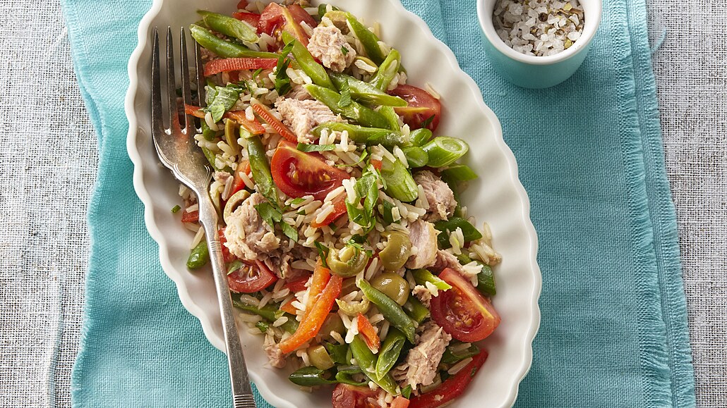 - Rýži uvaříme, scedíme, propláchneme studenou vodou, necháme okapat a vsypeme do velké mísy. Fazolky vaříme ve vroucí osolené vodě asi 1 minutu a poté opakujeme stejný postup jako u rýže. Nakrájíme je na kousky a přidáme do mísy. Následně přimícháme tuňáka, na nudličky nakrájenou papriku, rozčtvrcená rajčata, na kolečka pokrájenou jarní cibulku, petrželku a olivy.