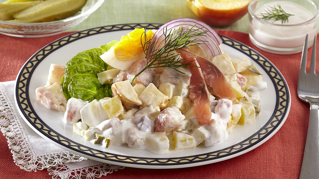 - V misce smícháme zakysanou smetanu s hořčicí, koprem a citronovou šťávou. Podle chuti dresink osolíme a přelijeme jím salát na talířích. Dozdobíme ho římským salátem a koprem.