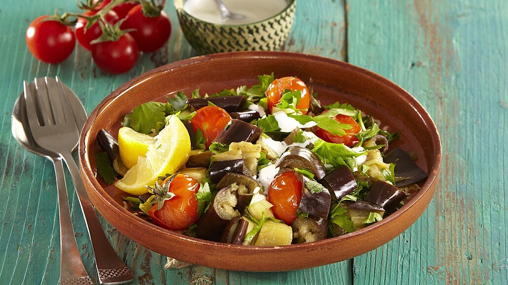 - Lilek smícháme s petrželkou, česnekem, pečenými rajčátky a olivovým olejem. Osolíme, opepříme a podle chuti přidáme citronovou šťávu a cukr.