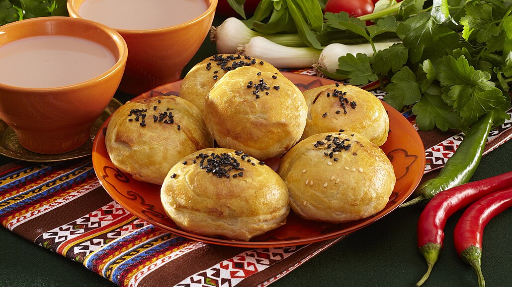 - Těsto nakrájíme asi na 1 centimetr silná kolečka, která rozválíme válečkem na tenké plátky. Na každý plátek položíme kousek masové směsi a zabalíme do bochánku. Potřeme rozšlehaným vejcem a posypeme černým sezamem. Bochánky rozložíme na plech vyložený pečicím papírem, vložíme do trouby vyhřáté na 190 °C a pečeme dozlatova.