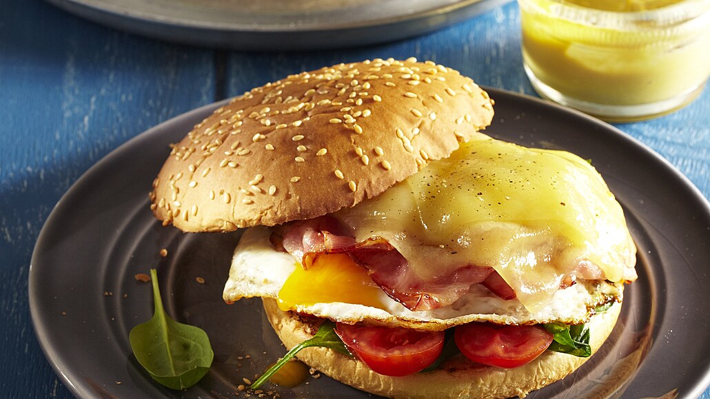- Na namazanou housku majonézou naskládáme špenátové listy, přepůkená rajčátka a slaninu s vajíčkem. Nakonec položíme dva plátky sýru cheddar a vložíme do trouby zapéct při 200 °C na 5 minut. Poté překlopíme druhou půlkou housky a podáváme.