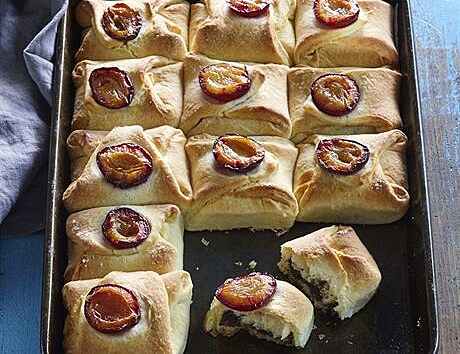 - Vykynuté těsto vyválíme na pomoučněném vále do čtverce. Rozkrájíme ho na asi 15čtverečků. Rohy potřeme rozšlehaným vejcem, do středu každého kousku dáme makovou náplň a protilehlé rohy těsta spojíme k sobě. Potřeme je máslem a vyskládáme vedle sebe do máslem vymazaného pekáčku. Navrch přimáčkneme půlku očištěné vypeckované švestky. Pečeme v troubě vyhřáté na 165 °C asi 40 minut.