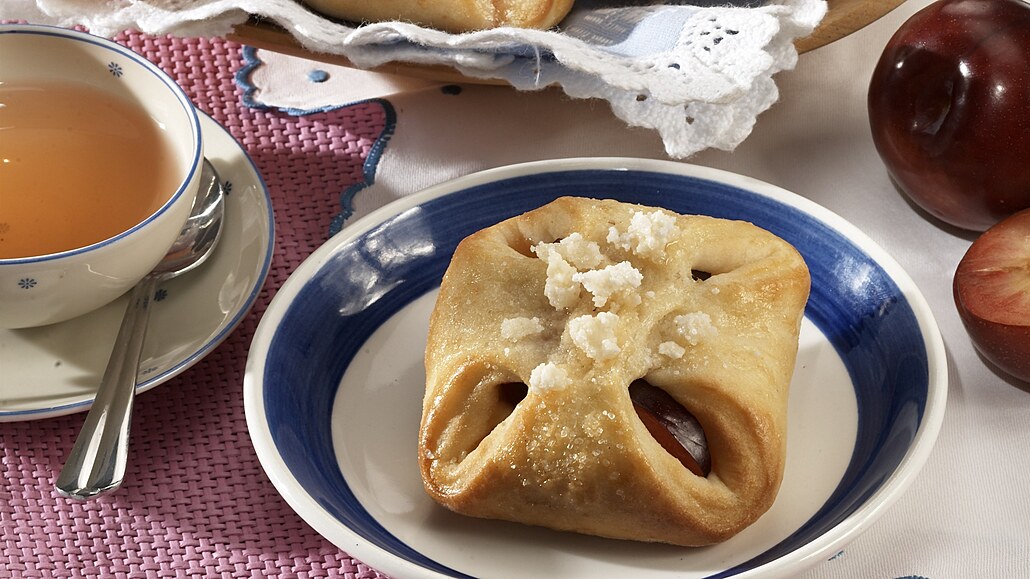 - Těsto rozválíme na pomoučněném válu na plát a rozdělíme na 10 čtverečků. Doprostřed každého kousku naneseme trochu pudinkového krému a položíme pár měsíčků slívy.