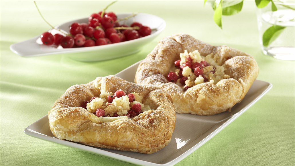 - Šátečky potřeme rozšlehaným vajíčkem. Doprostřed každého naneseme trochu tvarohové náplně. Koláčky dozdobíme rybízem, posypeme drobenkou a vložíme do trouby. Při 180 °C je pečeme 15-20 minut.