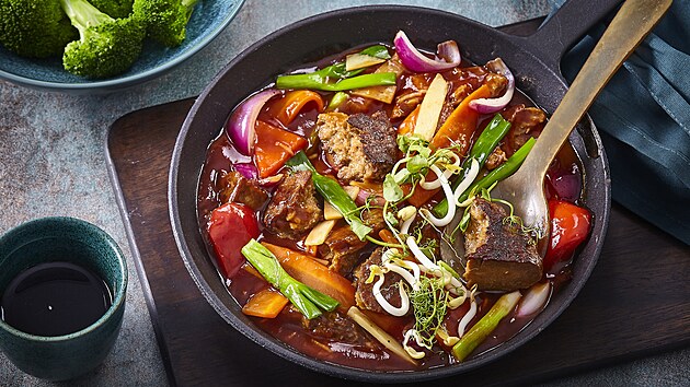 - Omáčku připravíme smícháním všech ingrediencí a nalijeme ji do pánve k zelenině. Přidáme seitan a na mírném ohni provaříme vše dohromady asi 5 minut. Podáváme například s dušenou brokolicí nebo jinou oblíbenou přílohou.