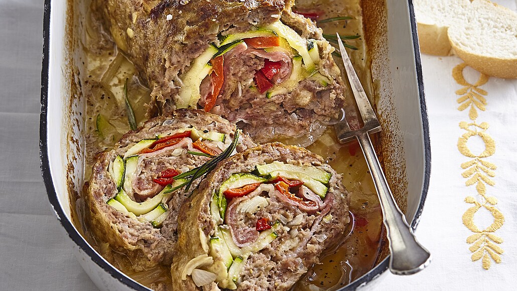 - Masovou směs rozetřeme do čtverce na potravinářskou folii a navrch rozložíme cuketu, papriky a plátky slaniny. Maso pomocí fólie opatrně zarolujeme.