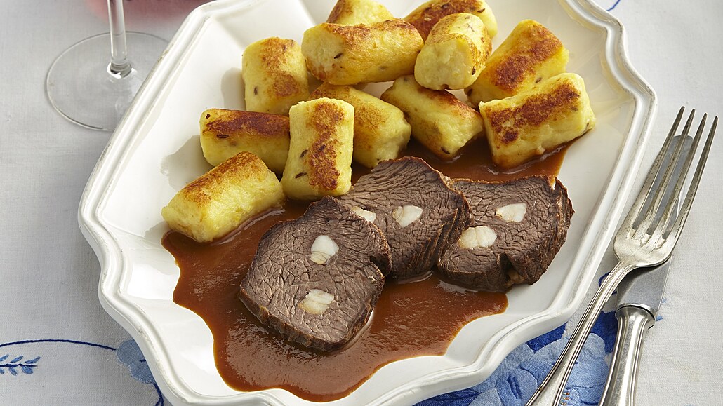 - Za sáčku vytlačujeme 5 cm dlouhé válečky přímo do vroucí osolené vody a vaříme je 5 minut. Pak je vyjmeme a ihned dáme zchladit do ledové vody. Před podáváním je ještě na troše sádla opečeme dozlatova.