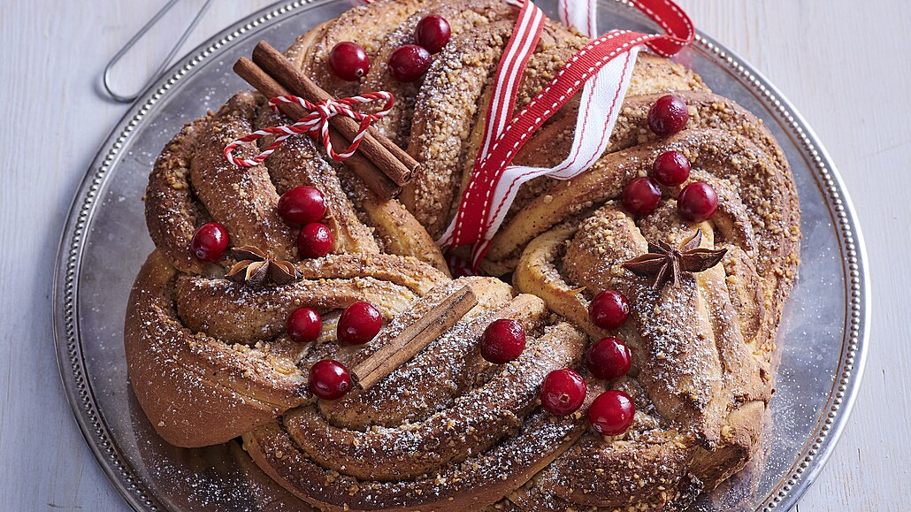 - Věnec položíme na plech vyložený pečicím papírem a necháme opět 15 minut odpočinout. Pečeme v troubě vyhřáté na 180 °C asi 15 minut, pak teplotu snížíme na 160 °C a dopékáme dalších 20 minut. Necháme vychladnout na kovové mřížce. Věnec můžeme ozdobit vánočně podle vlastní fantazie – třeba stužkami, celou skořicí nebo brusinkami.