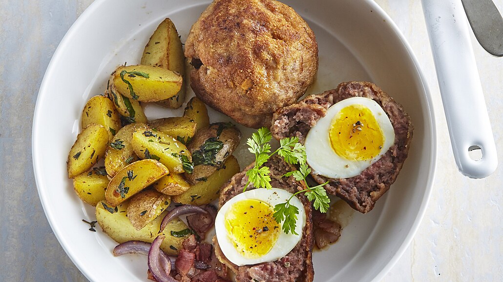 - Ve velké pánvi rozpustíme máslo a pozvolna na něm orestujeme cibuli rozkrájenou na proužky. Když zesklovatí, vmícháme slaninu nakrájenou na kostičky a společně ještě cca 2 minuty opékáme. Nakonec do pánve přidáme brambory a najemno nasekaný libeček. Opékáme je několik minut, dokud nezezlátnou a podáváme s osmaženými skotskými vejci.