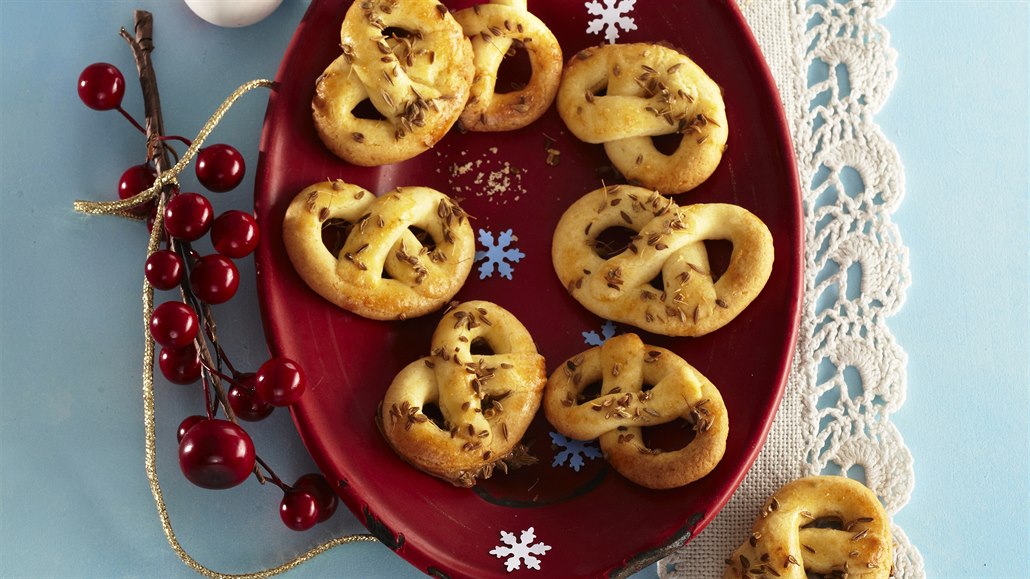 - Nakonec preclíky potřeme rozšlehaným bílkem a posypeme semínky anýzu. Pečeme ve vyhřáté troubě při 200 °C asi 15 minut.