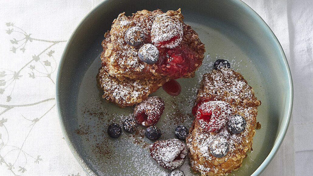- Namočené plátky bagety vyndáme, necháme lehce okapat a obalíme je v ovesných vločkách. Vložíme do pánve s rozpuštěným máslem a na mírném ohni smažíme asi 3 minuty dozlatova. Pak je obrátíme a dosmažíme i z druhé strany.