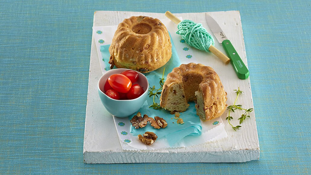 - Rozdělíme ho do 6 malých tukem vymazaných a moukou vysypaných formiček na bábovky (nebo do jedné velké formy). Necháme ještě 20 minut kynout. Pečeme v troubě při 175 °C asi 50 minut (v menších formičkách pečeme asi 25 minut).