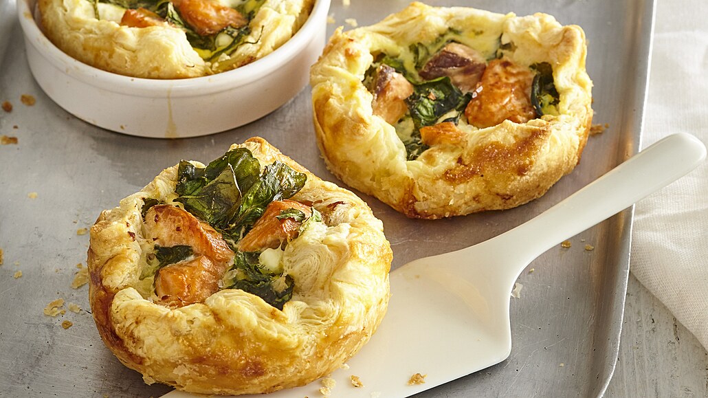 - Vymazané formy vyplníme těstem a do každé rozprostřeme rovnoměrně náplň. Lososa nakrájíme na kousky a rozdělíme do misek. Kraje těsta zahneme směrem dovnitř a pomažeme vejcem.