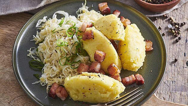 - Slaninu nakrájíme na kostičky a opečeme na pánvičce. K bramborám přidáme česnek a rozmícháme dohladka. Lžícemi tvarujeme nočky, které rovnou servírujeme na talíře, přelijeme vyškvařenou slaninou a podáváme doplněné kysaným zelím s nakrájenou jarní cibulkou.