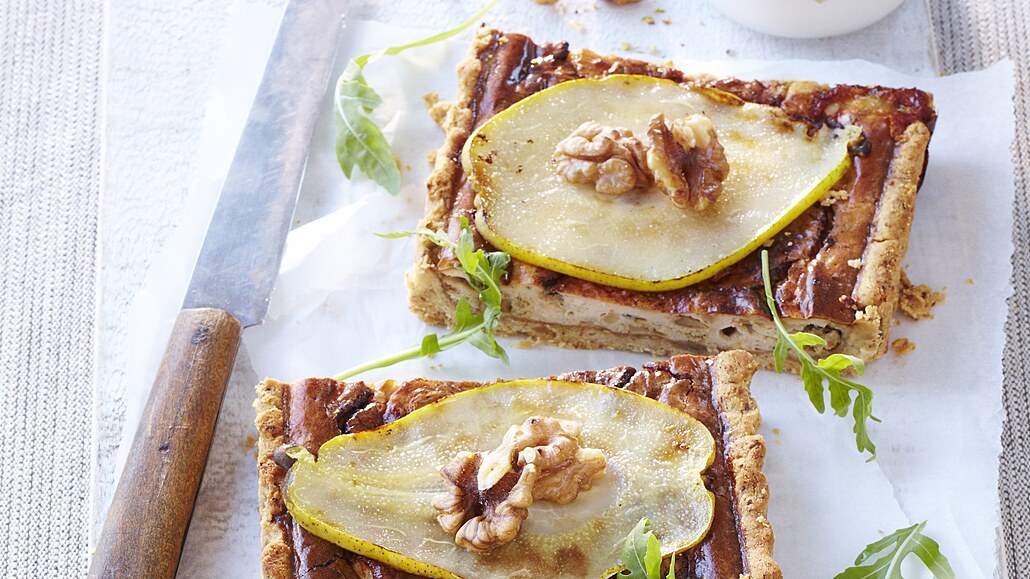- Plátky hrušek posypeme lehce cukrem a na rozpálené pánvi opečeme dozlatova. Rozložíme je na povrch náplně. Koláč dozdobíme na oleji opečenými ořechy a okapanými propranými listy rukoly. Podáváme ho zakapaný ořechovým olejem. Koláč chutná nejlépe zchladlý na pokojovou teplotu.