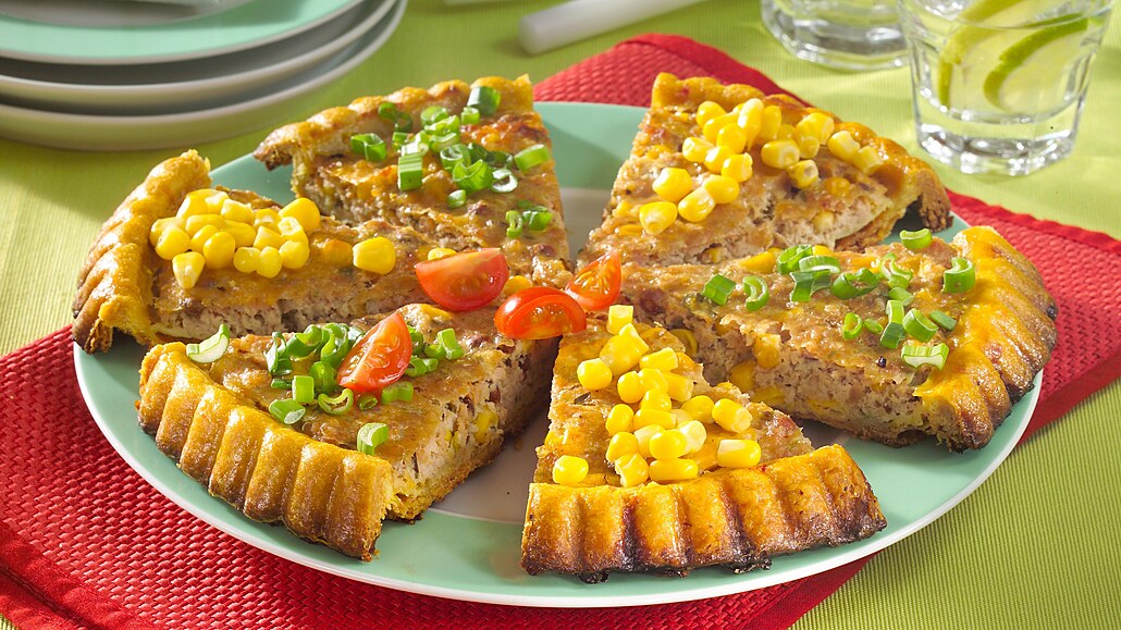 - Do vychladlé jíšky zapracujeme vejce a mleté maso. Přidáme okapanou sterilovanou kukuřici, červený pepř, nadrobno nasekanou bazalku a petrželku, osolíme a vše důkladně promícháme.
