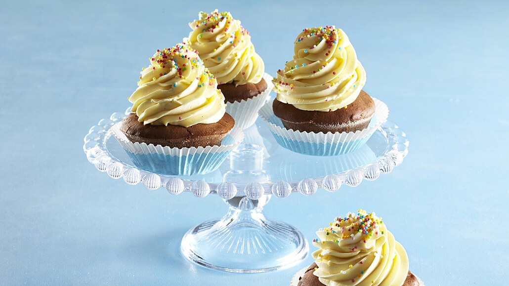 - Změklé máslo vyšleháme s dření z vanilkového lusku a slazeným mlékem do pěny. Krém naplníme do cukrářského sáčku s řezanou trubičkou a ozdobně nastříkáme navrch vychladlých muffinů. Nakonec posypeme barevným máčkem.