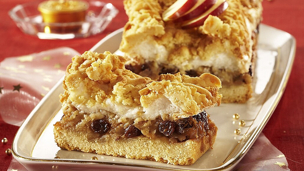 - Vyjmeme těsto z chladničky, vyložíme jím dno chlebíčkové formy a dobře přitiskneme. Na těsto navršíme jablkovou náplň a navrch rozetřeme bílkový sníh. Těsto z mrazničky nastrouháme nahrubo a celý povrch posypeme nudličkami těsta. Pečeme ve vyhřáté troubě při 180 °C asi 40 minut. Po upečení necháme vychladnout ve formě, pak opatrně vyjmeme a nakrájíme na řezy.