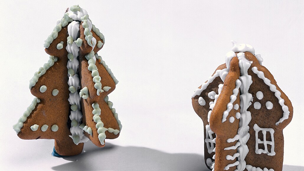 - Pokud perníčky chceme zavěsit na vánoční stromek, vkládáme mezi ně při slepování ozdobnou stužku. Pro větší pestrost můžeme bílkovou polevu obarvit potravinářskou barvou.