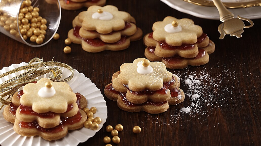 - Odleželé těsto rozválíme na plát silný 3 mm a vykrájíme tři velikosti kytiček, od každé velikosti stejný počet. Rozložíme je na plech na pečicí papír a pečeme v předehřáté troubě na 180 °C asi 15 minut. Po upečení necháme vychladnout na kovové mřížce.