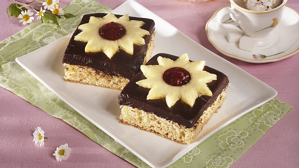 - Vychlazený krém vyšleháme a rozetřeme na korpus. Poklademe ho kolečky ananasu a moučník rozkrájíme na kostky. Středy sluníček můžeme vyplnit džemem nebo třešněmi.