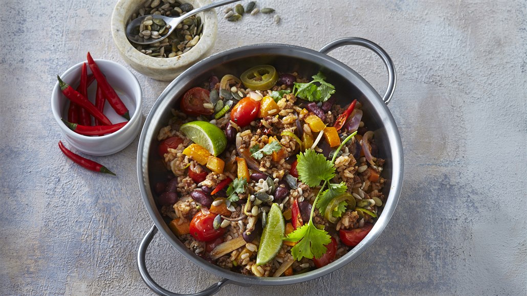 - Pak přidáme česnek, rajčata, papriku, chilli papričku, fazole, jalapenos, přilijeme vývar, vše zamícháme, přikryjeme pokličkou a dusíme asi 15 minut. Poté osolíme, opepříme, stáhneme z ohně a necháme dojít asi 5 minut. Před podáváním zakápneme limetkou a pro intenzivnější chuť přidáme snítky čerstvého koriandru.
