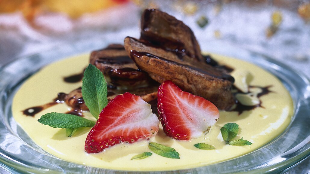 - Servírujeme tak, že omáčku nalijeme na talíř, čokoládovou omáčkou vytvoříme vzory. Na takto připravený podklad položíme pár kousků smažených banánů. Dozdobíme čerstvými jahodami a lístky máty.